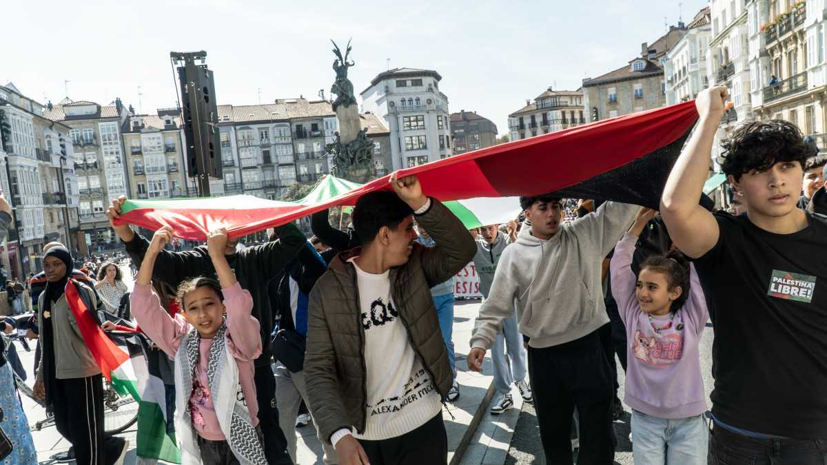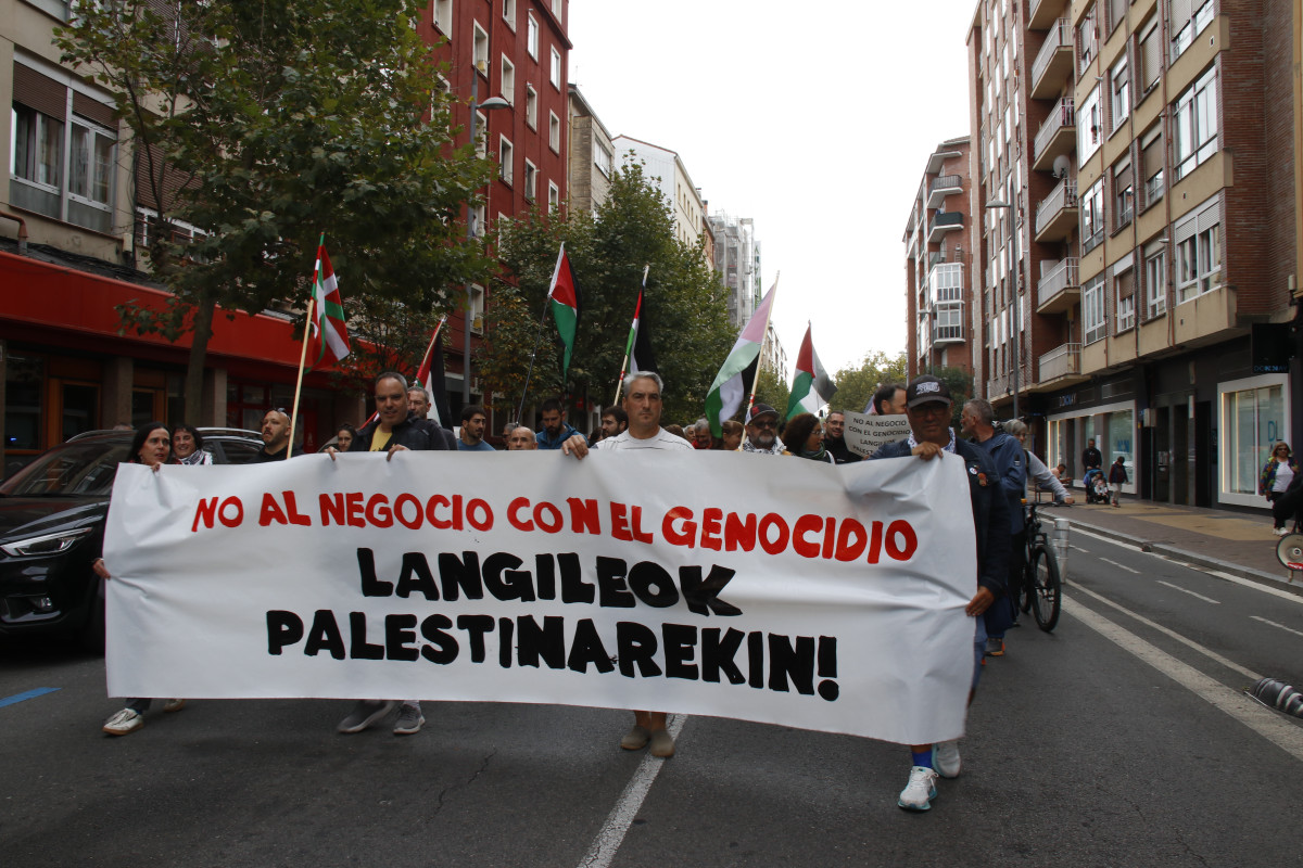 Goizeko 10.30ak aldera hasi dira hiriko hainbat txokotan zutabeak biltzen, lantokietatik, batez ere. 12:30etan egin dute bat Andra Mari Zurian. Mobilizazioaren amaieran Israelgo Estatuarekin harreman ekonomiko eta instituzionalak eteteko eskatu dute sindikatuek.