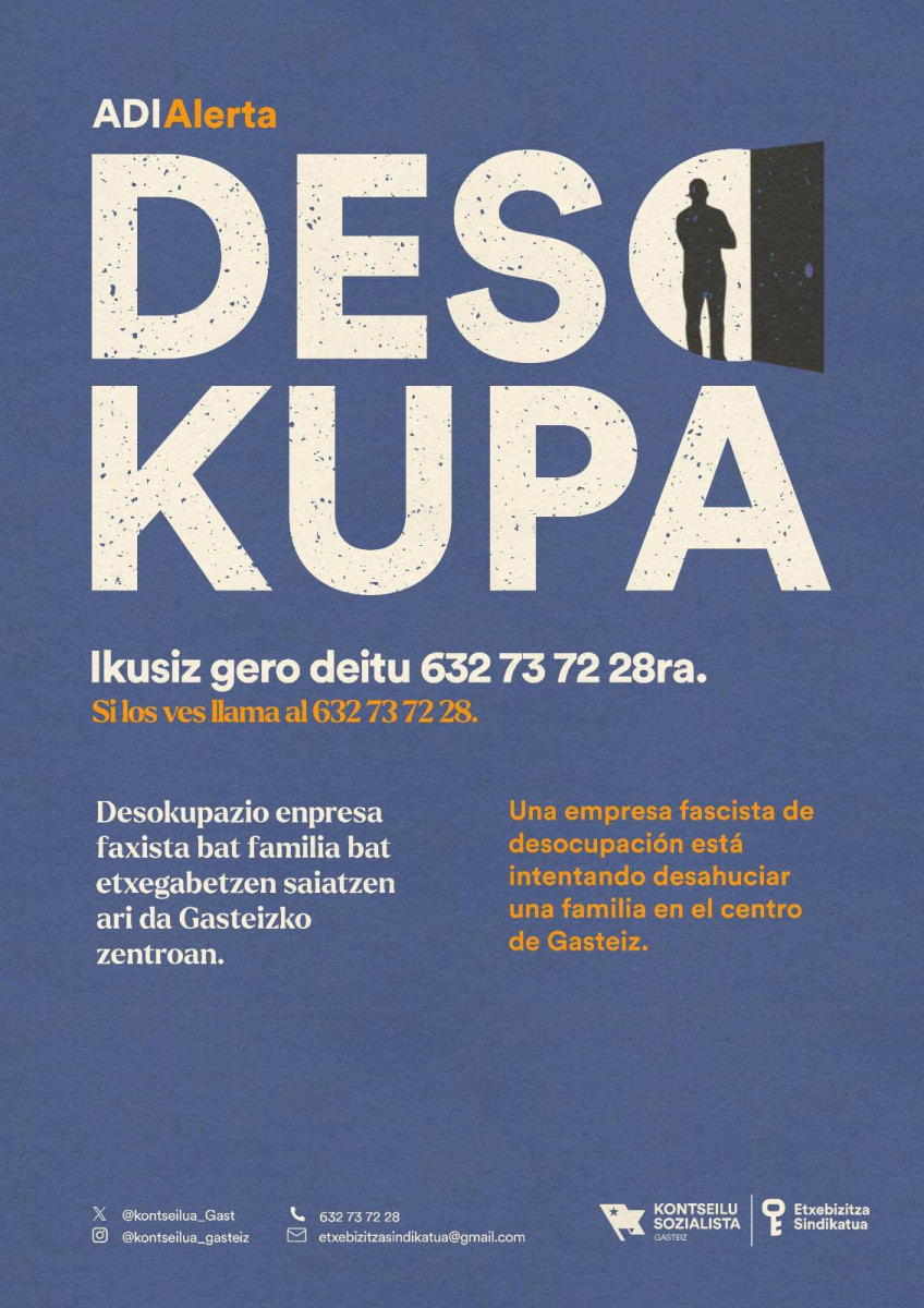 Desokupazio enpresa faxista hauek gero eta ohikoagoak dira. Aurreko astean, lau esku-hartze egon ziren Hego Euskal Herrian. Salatu dute desokupek “inpunitate osoz jarduten dutela, poliziaren eta estatuaren onespenarekin eta hedabideek zein sare sozialek anplifikatuta”. Enpresa hauek langile klasearen kriminalizazio eta familia langileen praktiken normalizazioan funtsezko papera jokatzen dutela mahaigaineratu dute, eta “faxismoaren eta diskurtso antiproletarioen aurrelariak” direla.